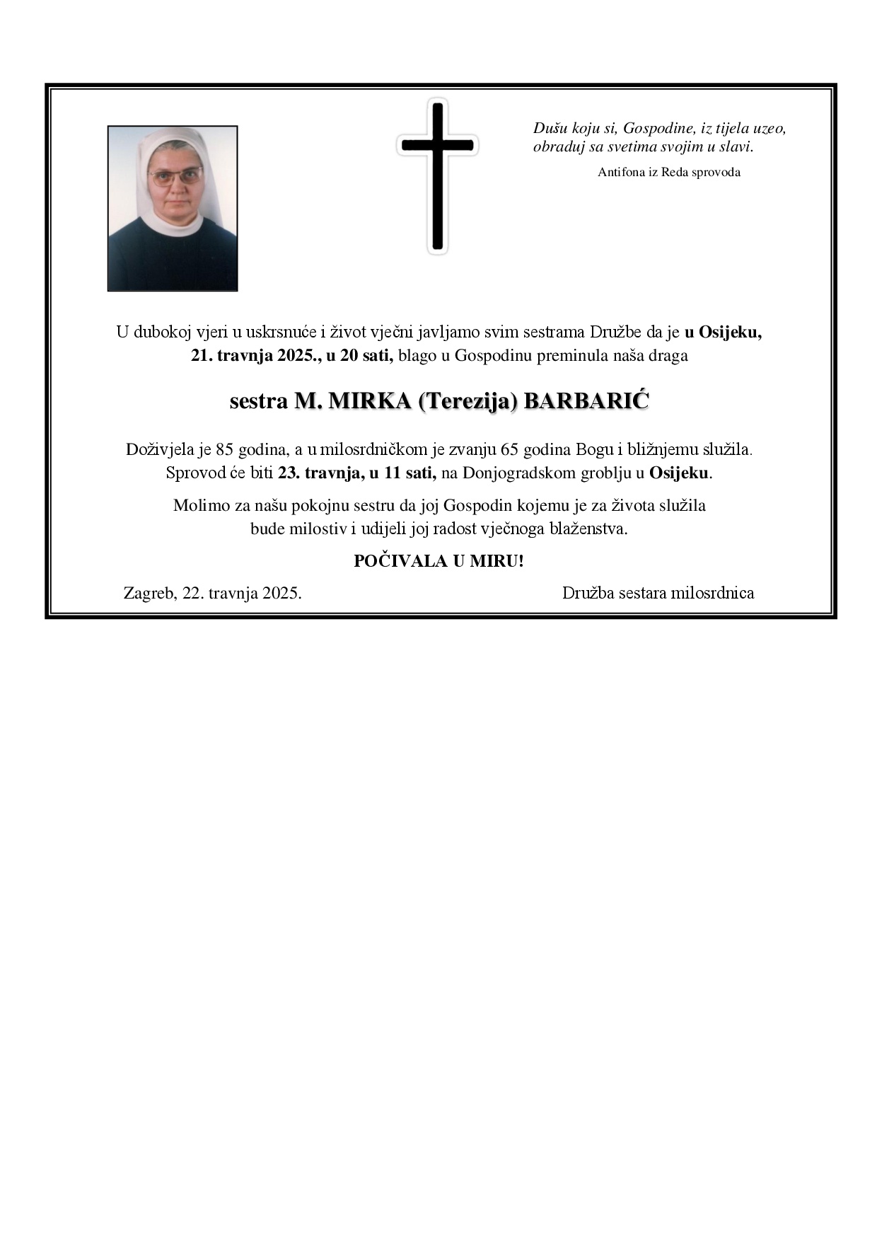Draga naša s. M. Mirka, Krist – pobjednik života nad smrću neka Vam bude nagrada za sve napore učinjene za dobro Družbe i onih kojima ste svjedočili ljepotu i uzvišenost poslanja milosrdničkog služenja. Neka Vam Gospodin udijeli vječnu radost i sreću u društvu „bijelih“ sestara. Počivala u miru Božjem!